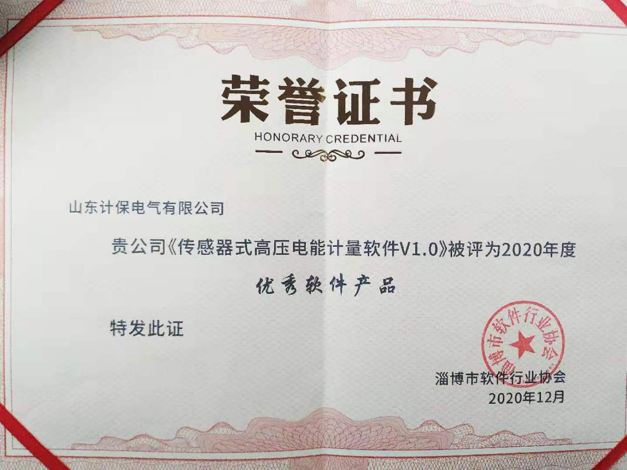 2020年12月,山東計保電氣有限公司《傳感器式高壓電能計量軟件V1.0》榮獲淄博市軟件行業協會“2020年度優秀軟件產品”獎。該產品可用于高壓電能表、智能型高壓開關、環網柜計量裝置等電能計量設備,用來實現高壓電能的計量、測量、控制,提供電能、電壓、電流、功率、功率因數等相關電量,可以完全替代互感器+電能表的傳統計量裝置,實現其原有功能,是智能電網建設AMI高級測量體系的優先產品。其中,傳感器式高壓電能計量軟件+高壓傳感器組成的傳感器式高壓電能表首次構建起高壓電能計量新體系,實現了高壓電能計量的新跨越。被業內專家鑒定為“國際首創、國際先進”。
